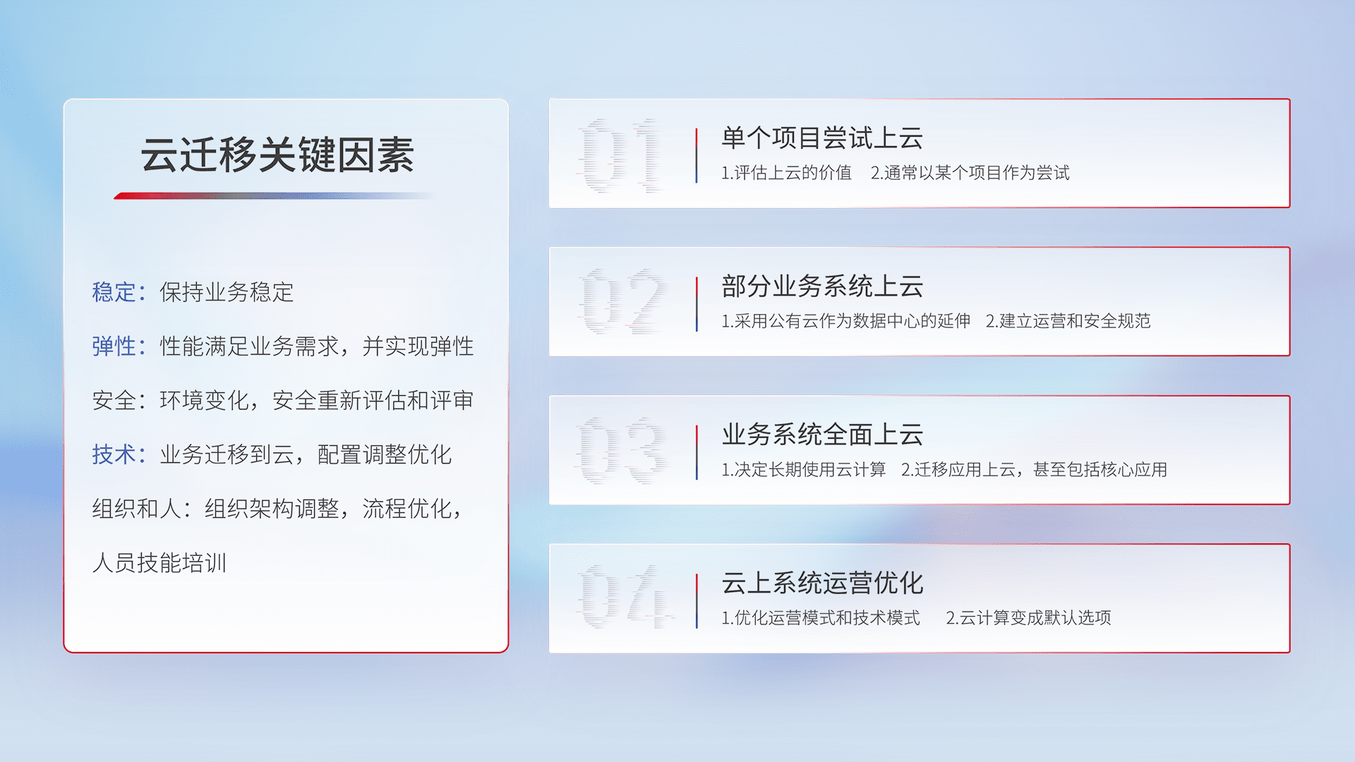 结合实际业务,,,,从规划设计、、、、云平台选型、、、、云原生改造、、数据迁移、、、、集成交付,,,,迁移全过程为客户识别最佳上云路径,,做好风险识别管理,,设计网络架构、、、身份权限、、、、安全审计合规、、、、操作审计、、日志审计、、、、监控告警策略、、、多站点容灾设计等,,对云上基础设施进行整体规划,,,提升IT治理水平,,,,以满足弹性、、、高可用、、、、高性能的需求。。