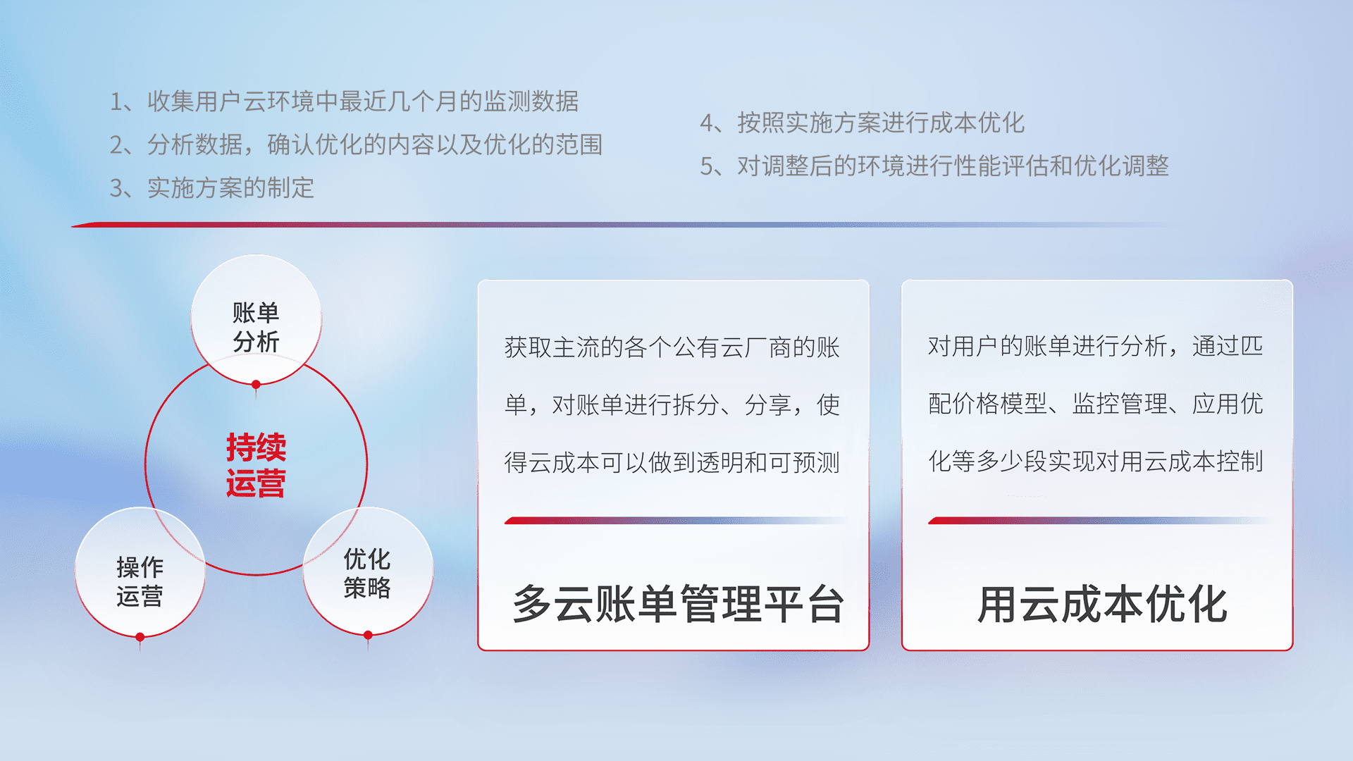 通过多云纳管,,,以统一的资源数据模型把客户的云资源进行抽象和封装,,,,进而实现对多云资源的统一操作,,,保障云资源管理的可靠性、、、稳定性与可用性。。。量身定制化运维内容,,,,配置、、开发运维、、、、补丁管理、、、、备份、、监控、、认证和访问管理、、、、审计和日常巡检等,,,保障在用云过程中的可靠度,,,,稳定度以及高可用率。。。。